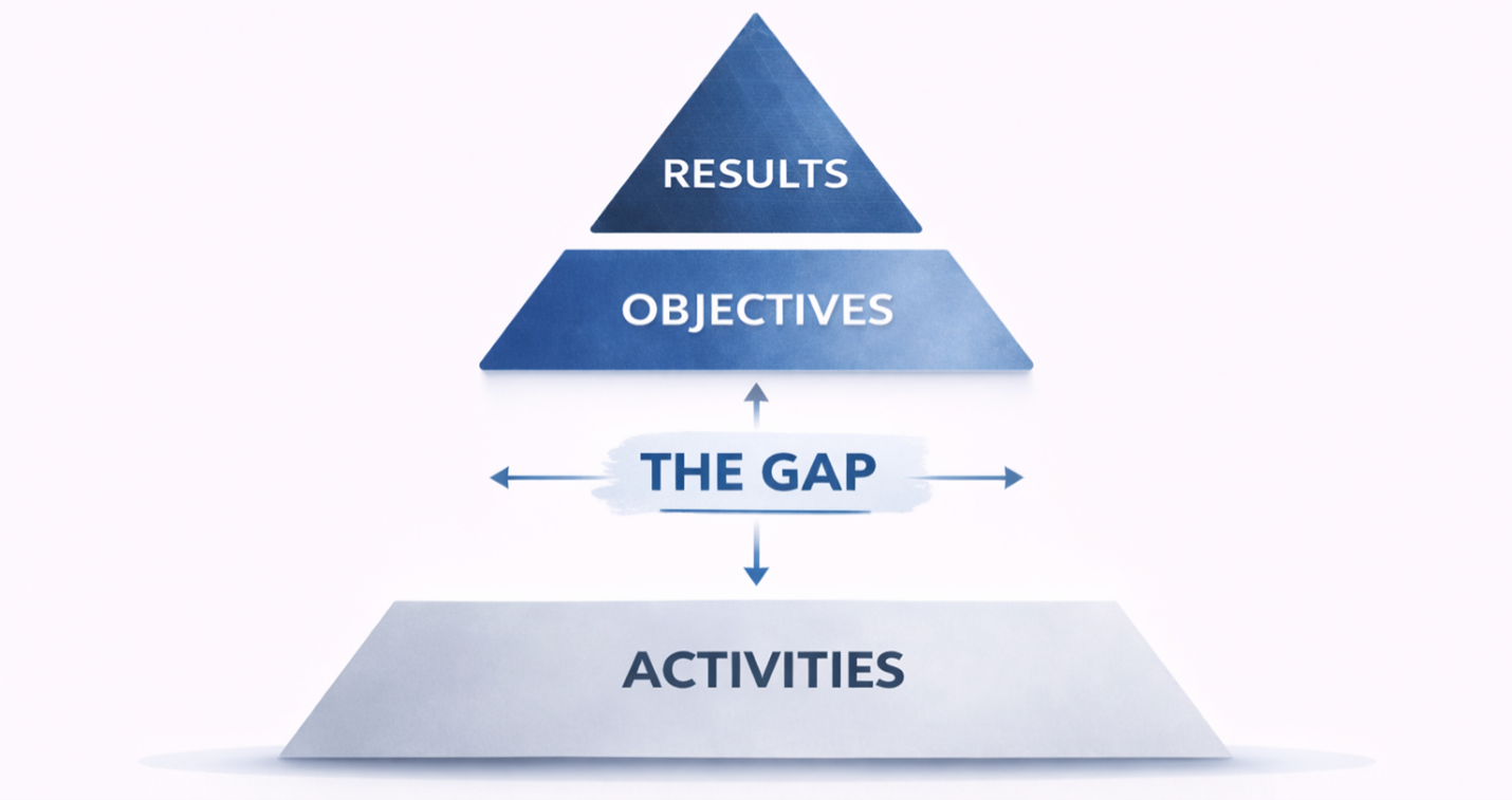 רוב הארגונים מנוהלים היום עם הרבה מאוד דאטה – ומעט מאוד שליטה אמיתית. כדי להבין למה, בואו נסתכל על חברה עסקית באמצעות מודל פשטני בעל שלושה מרכיבים, או שלוש רמות: תוצאות (Results), יעדים (Objectives) ופעילות (Activity).