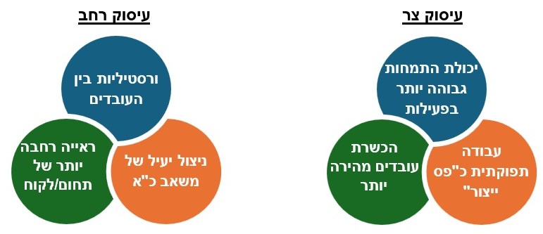 רמת חשיפה וסיכונים – ככל שרמת החשיפה בתהליכים עולה, יש צורך בעובדים בעלי רמת מקצועיות גבוהה יותר ובקיאות גבוהה יותר בעולם התוכן. בכדי לצמצם את הסיכונים, נשאף למקד את העיסוקים כמה שניתן (=צר).